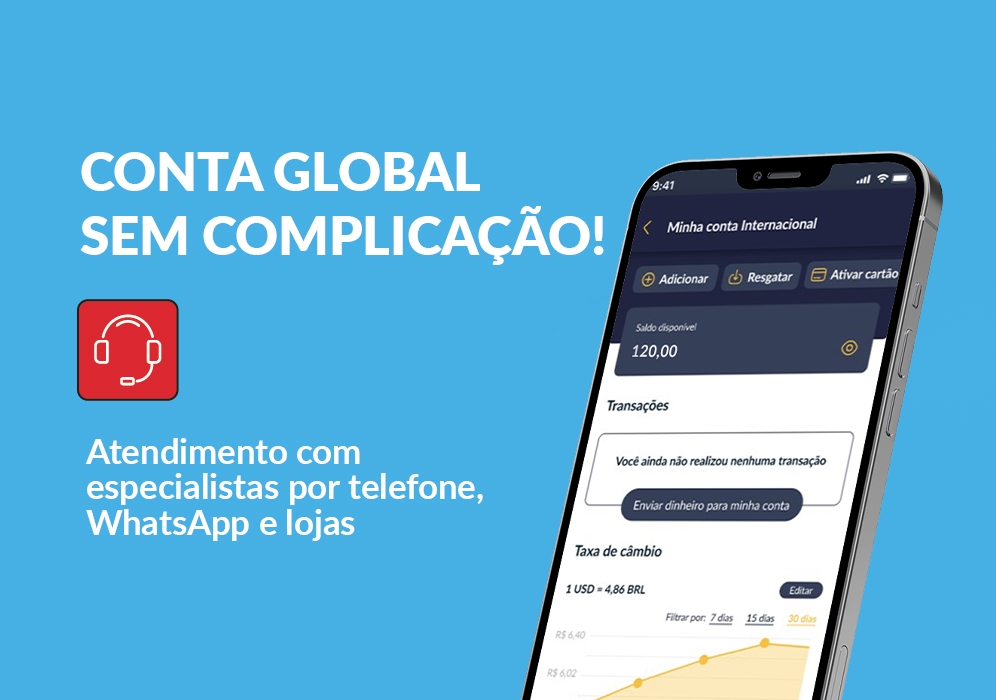 A Conta Global é uma carteira eletrônica em moeda estrangeira que possibilita uma maneira prática de administrar seu saldo em diversas moedas e de realizar pagamentos com um cartão virtual VISA Platinum.